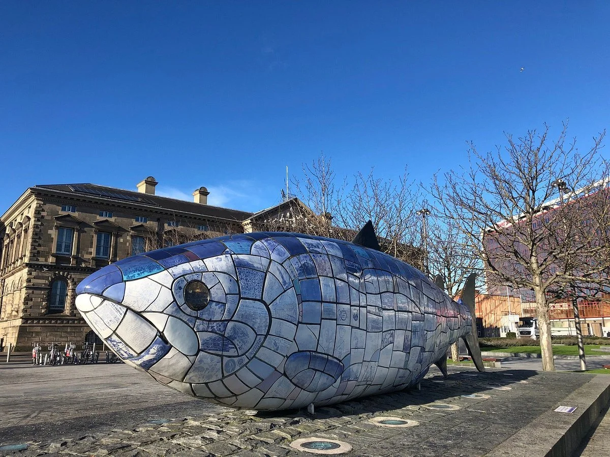 If you're visiting the Lagan Lookout, or admiring the Customs House, you'll notice a big fish sculpture beside the Lagan. It was created by John Kindness, and the most interesting thing about this fish are its beautiful blue scales, which are made up of ceramic tiles describing different scenes from the city's history.